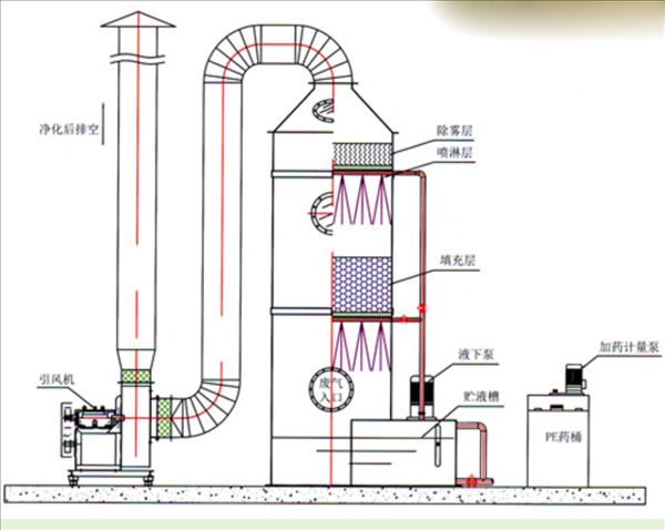 廢氣由風(fēng)機壓入凈化塔的鈞壓室,經(jīng)過不等速回式的噴霧處理進入內(nèi)塔處理器,廢氣穿過由新穎鮑爾環(huán)組成的填料層,進入二道噴霧處理,使氣液兩相充分接觸,發(fā)生中和反應(yīng),然后經(jīng)過脫液處理排入大氣,凈化后的廢氣達到國家規(guī)定的標(biāo)準(zhǔn)。